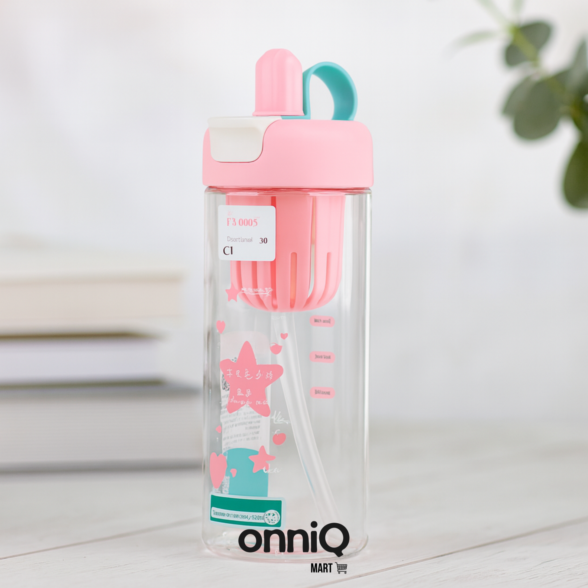 A cute and practical water bottle with a pink lid, straw, and decorative love-themed design.